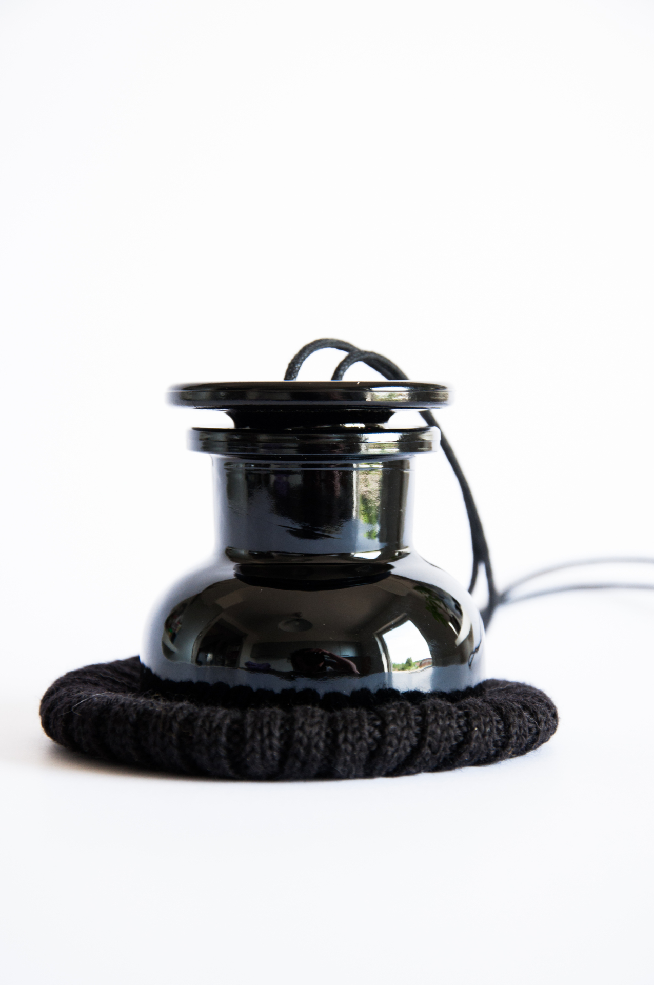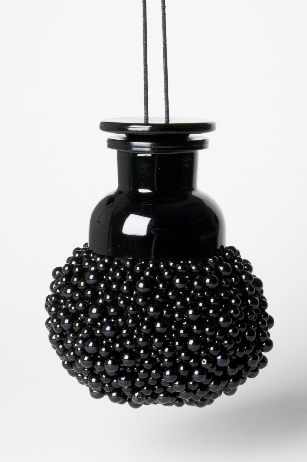This series of work was created in the context of 'Toegepast 16', a design competition for young talent organized by 'Cultuurplatform Design'. The archetypical pharmacy bottle was the starting point for this project. In contemporary, industrial and identical manufactured pharmacy bottles interventions were made and other materials were joined, both manual and industrial, to create jewellery and objects that attain a more human touch. Hereby, individual and simultaneous uniform pieces arose with the aid of a mass-produced item. Every violet glass pharmacy bottle was cut by hand and tranformed into a new object, pendant or bracelet, taking into account the form and function of the original artefact.