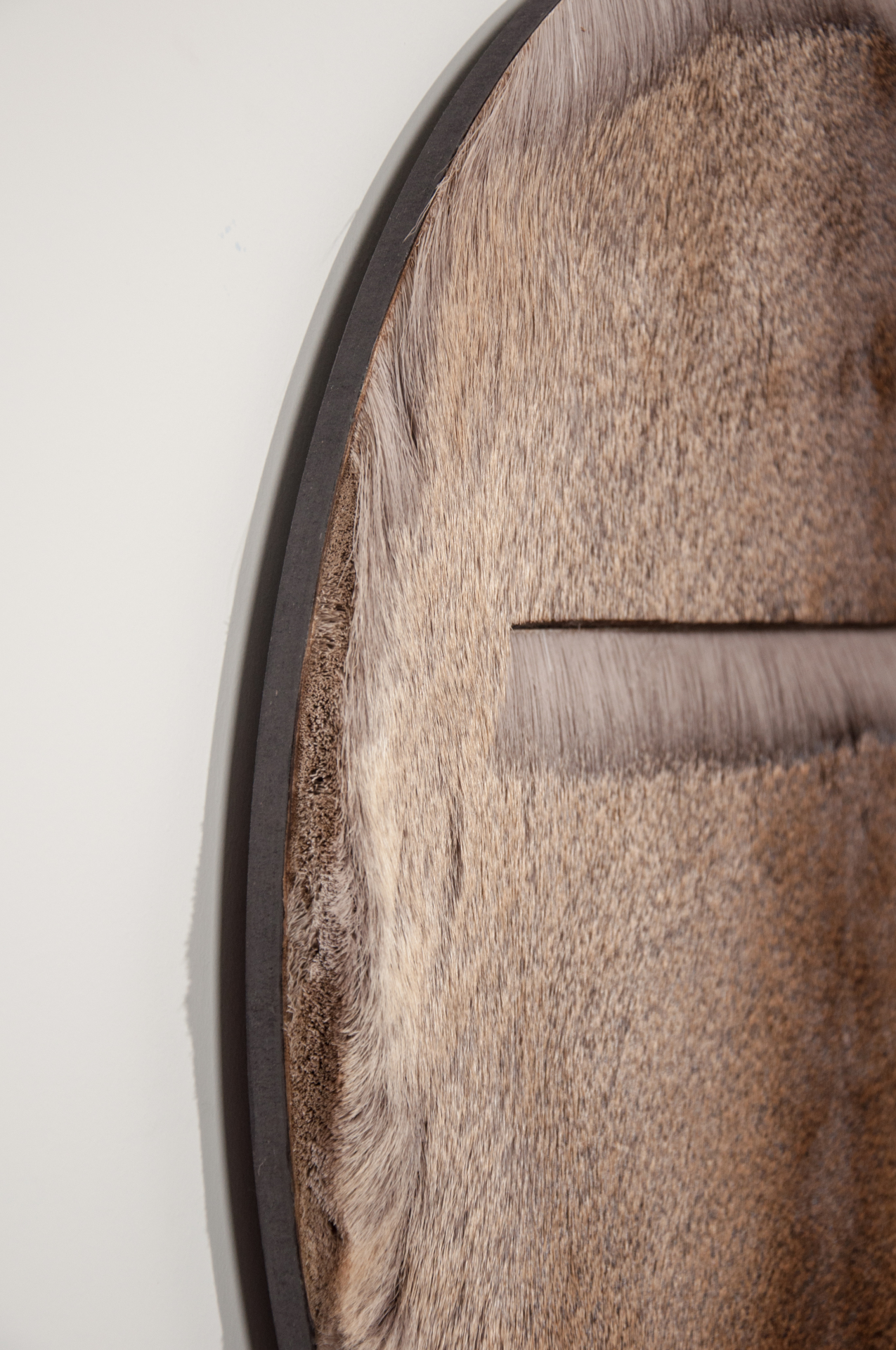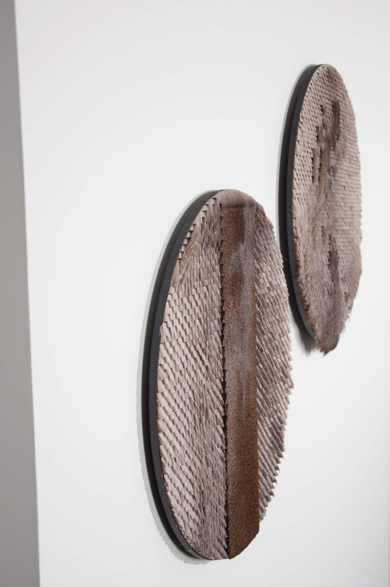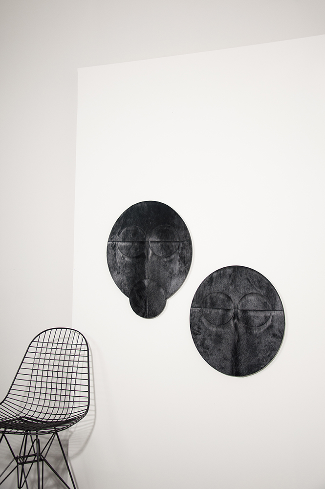 The wall objects show the fragment on the one hand as a survived part of the hide from which it originated, on the other as abstract shields, a protective object for humans and animals.