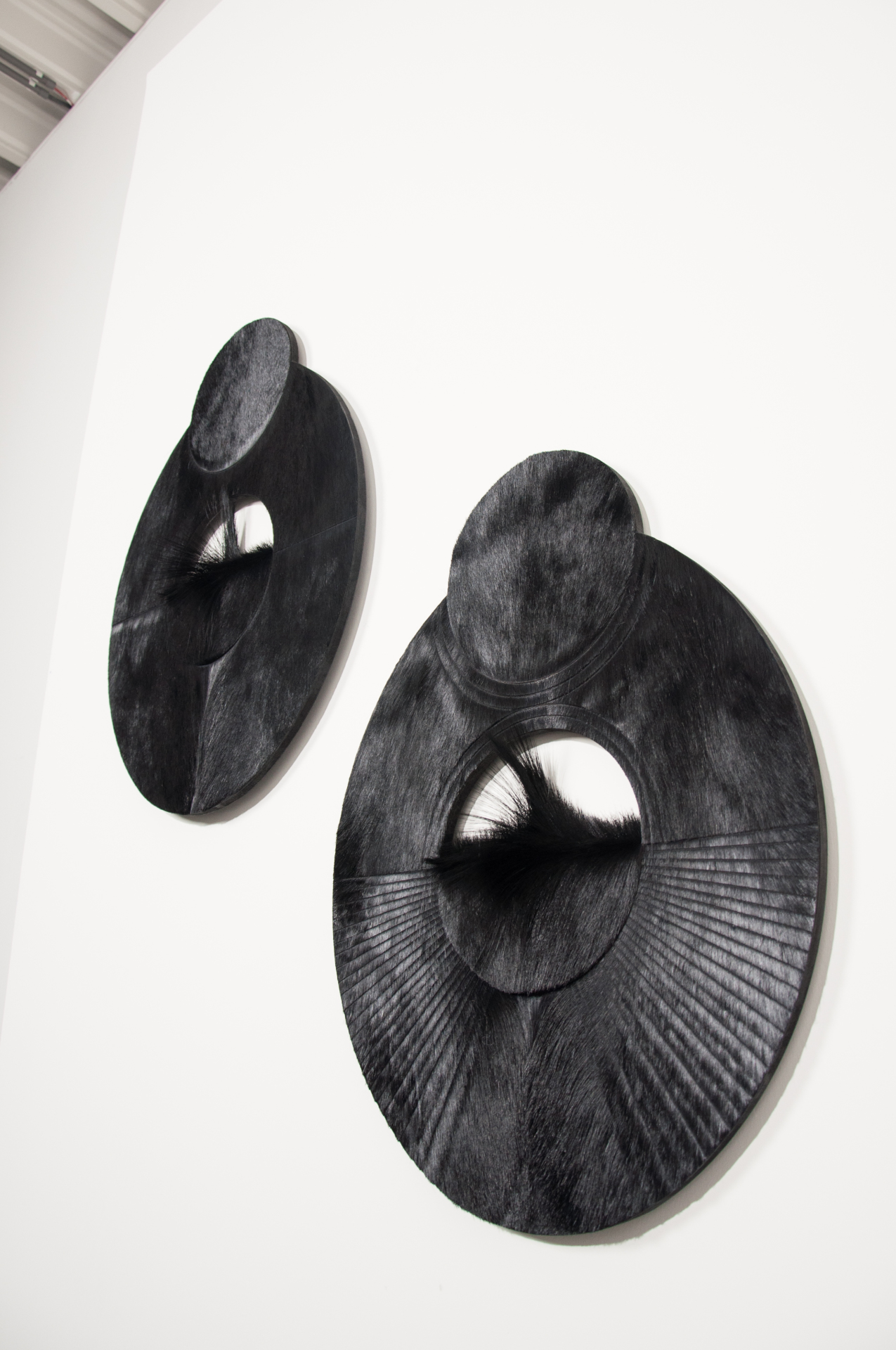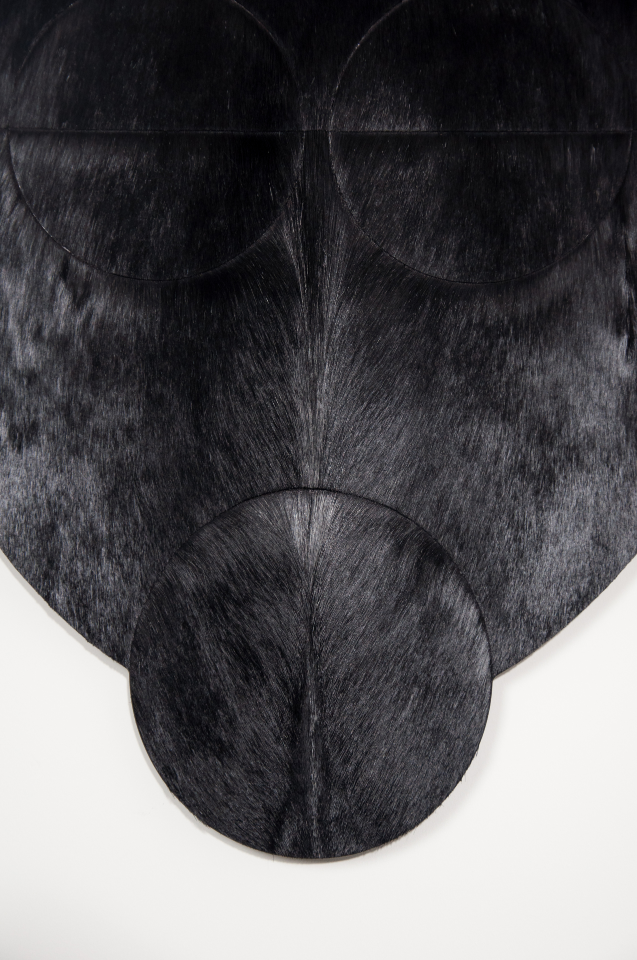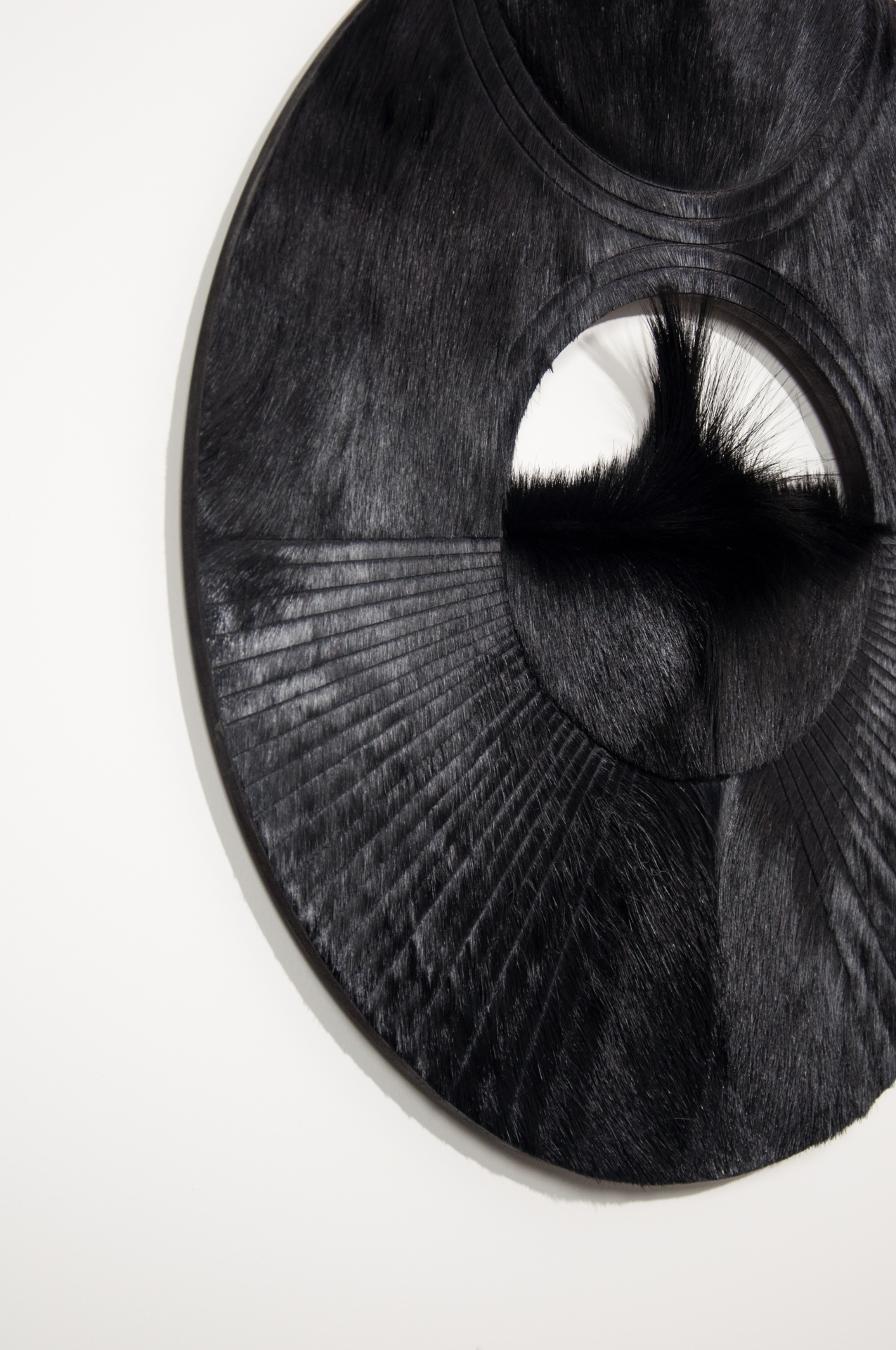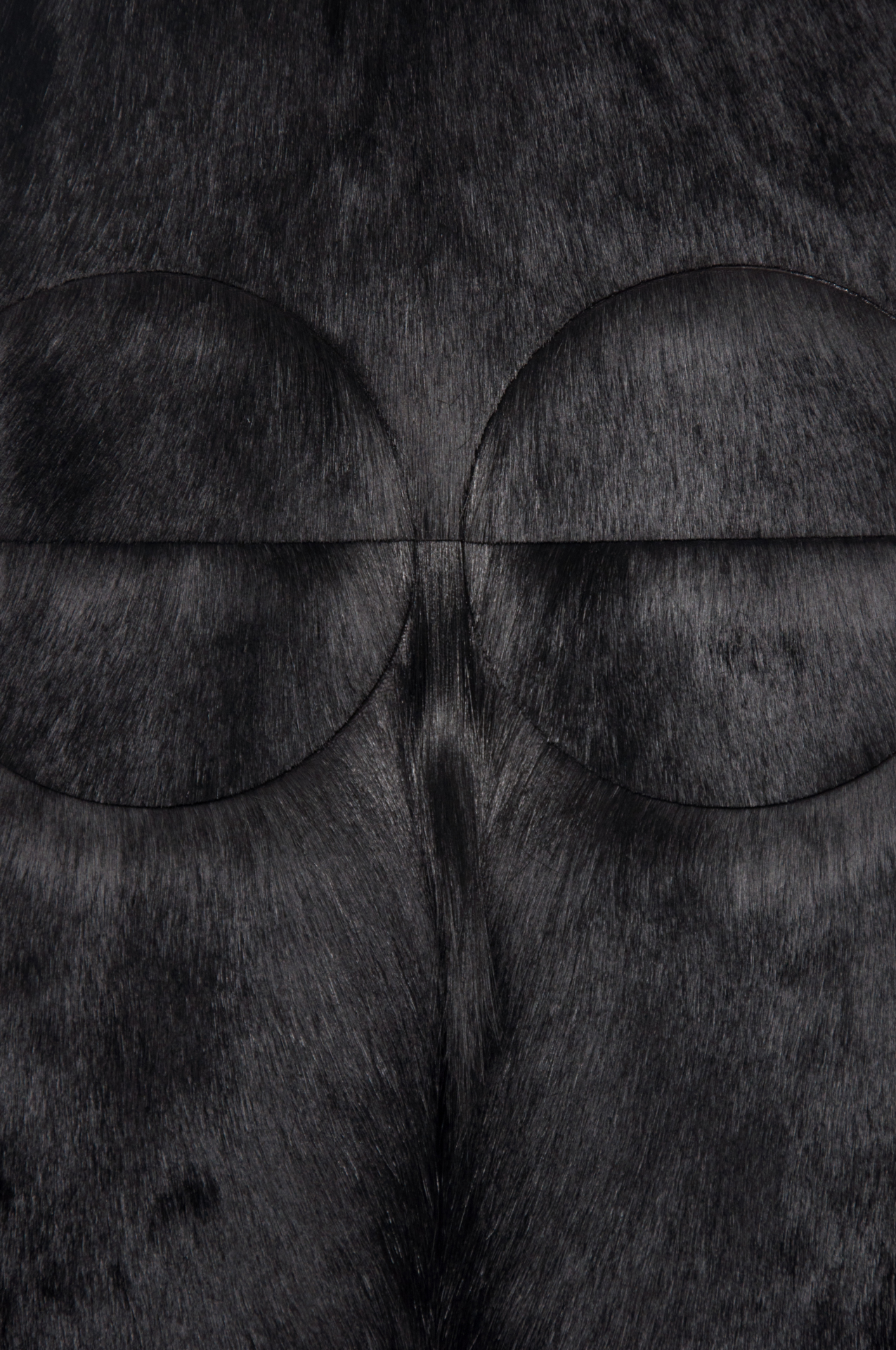 Decorative engravings in combination with the natural hair direction and hair length of the deep black springbok skin fragments create an intriguing surface in the 'Transmuted' objects. It’s a feast of black hair, light reflections and different directions focusing on the monochrome matter as material and subject.