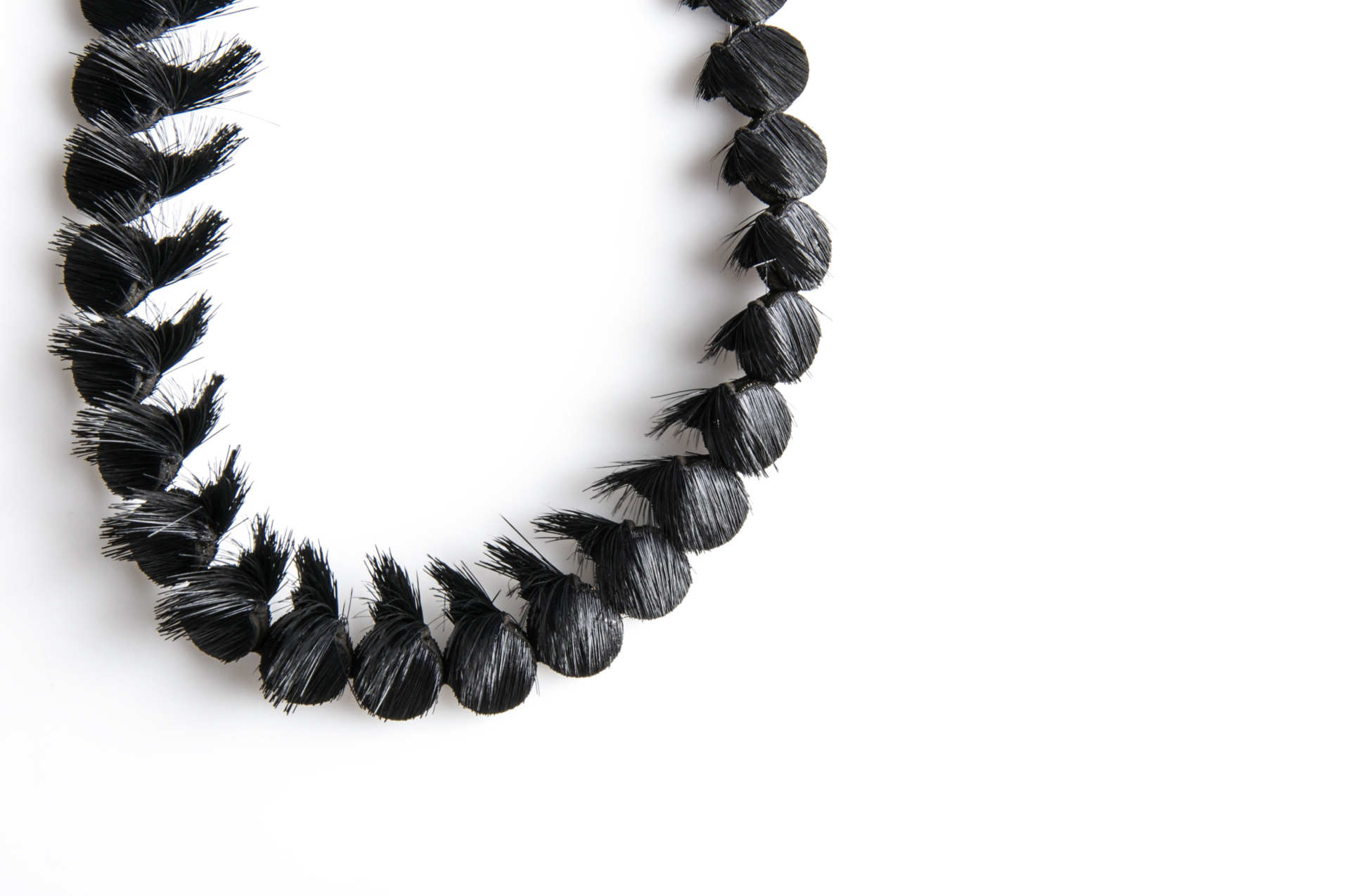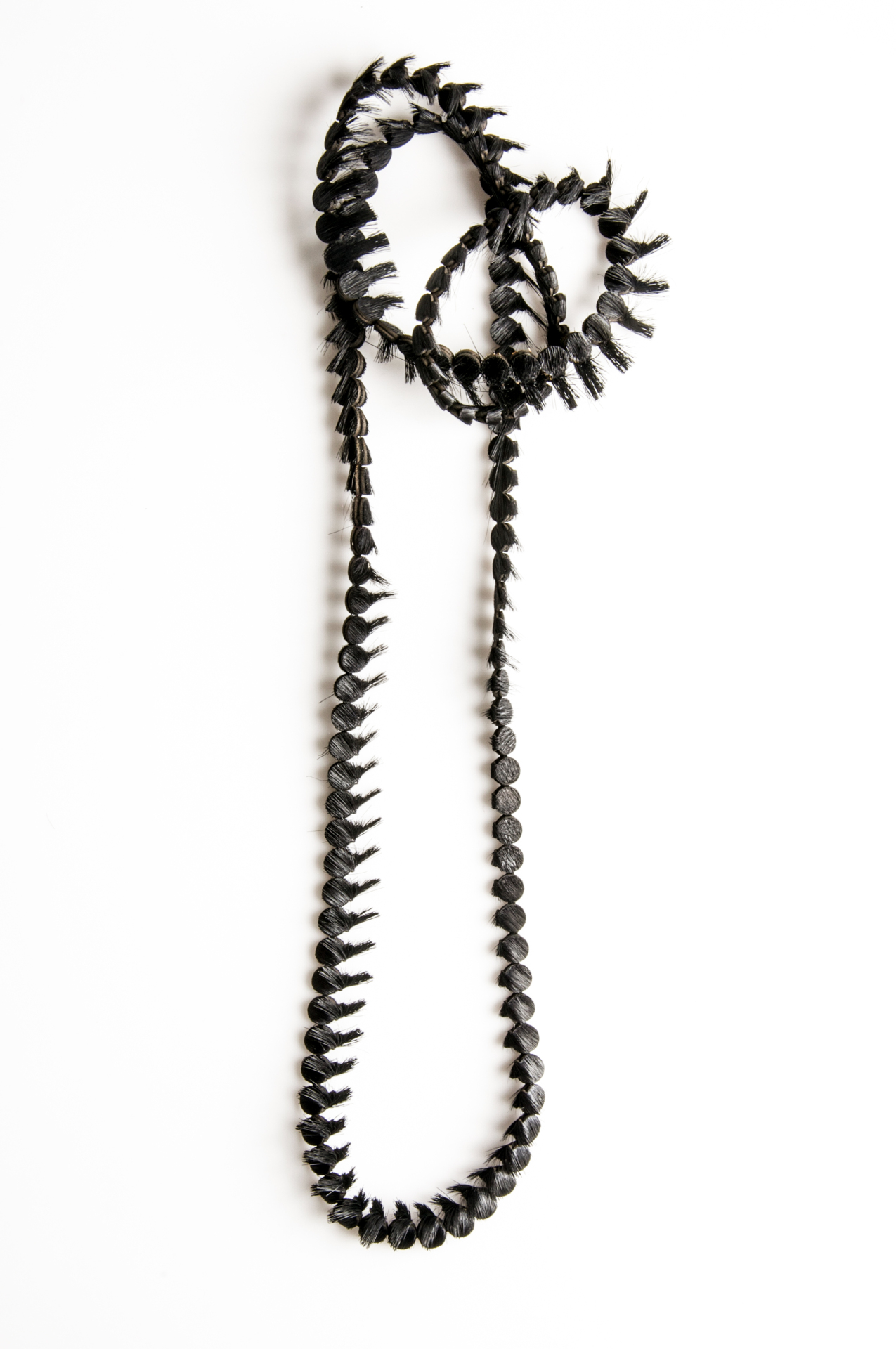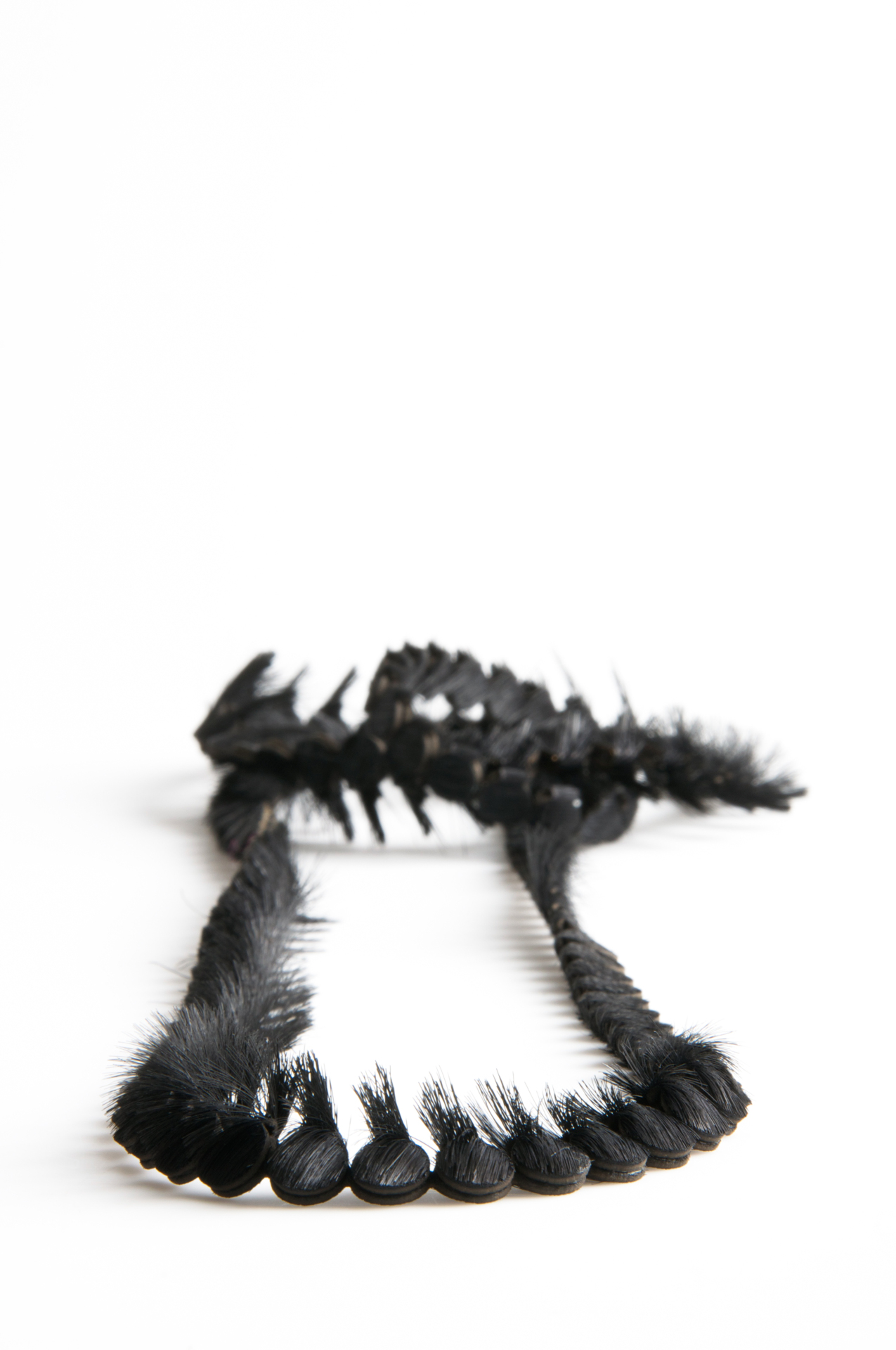 The 'Small Folded Flatbeads' necklaces refer to a stereotypical pearl necklace on a two-dimensional level. These necklaces emerged in a playful approach with the flexibility and the three-dimensional character of the skins and the hair, triggered in different ways.